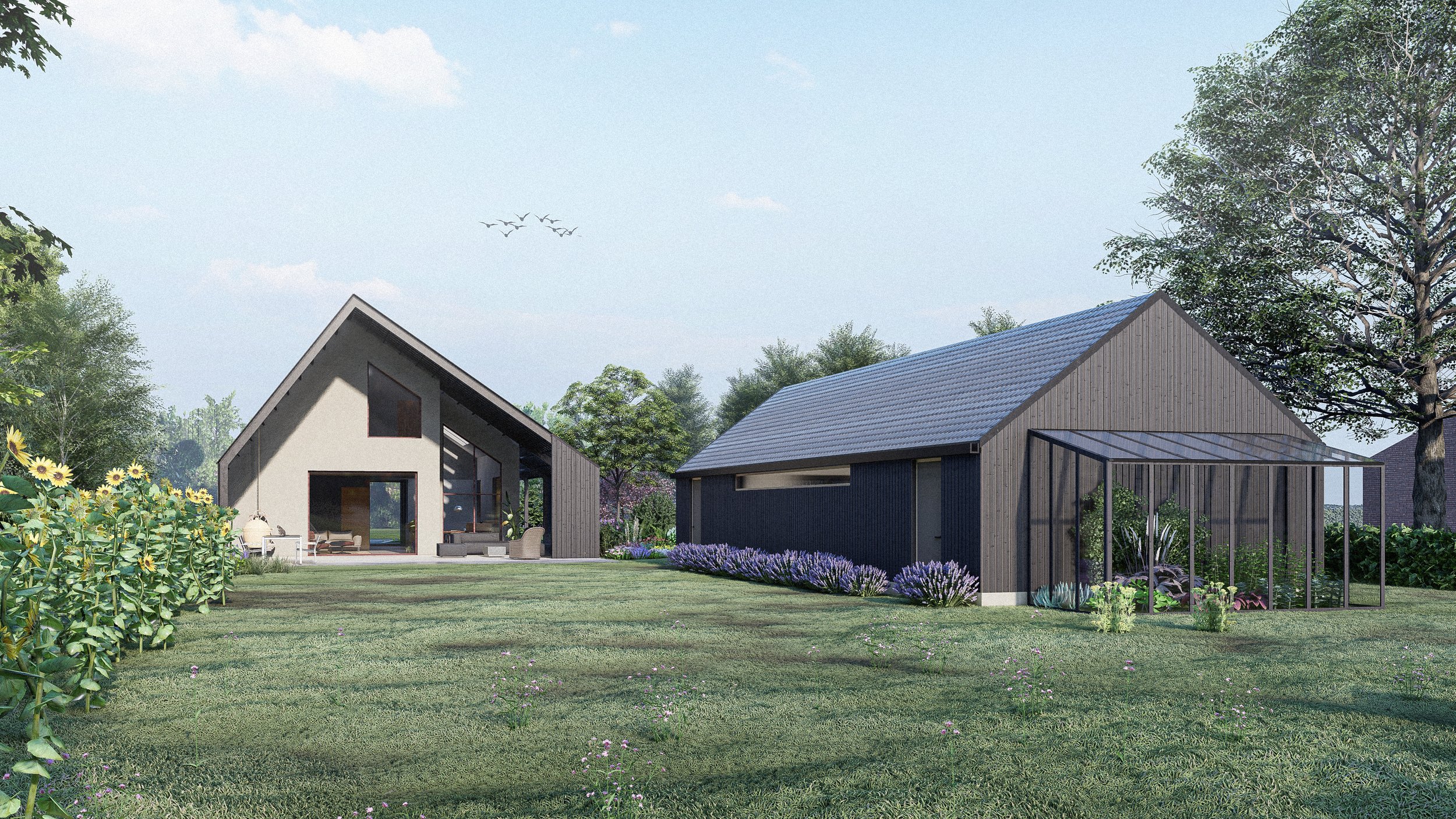 Ontwerp voor een nieuw te bouwen ruime vrijstaande (schuur)woning met schuur. De vormgeving van de woning is gebaseerd op het principe van passief bouwen met een groot overstek op de zuidzijde, waar de tuin en de leefruimte van de woning samenkomen. De woning krijgt een (gebrand) houten gevel met een zinken dak. Grote schuifdeuren in de voor- en zijgevel dragen bij aan het karakter van een schuurwoning. Onder het overstek openbaart deze schuurwoning zich juist meer als een eigentijdse villa met licht beige gestucte gevels en blank houten kozijnen.